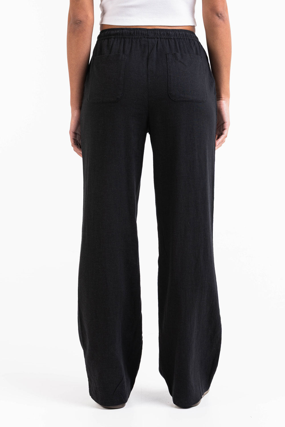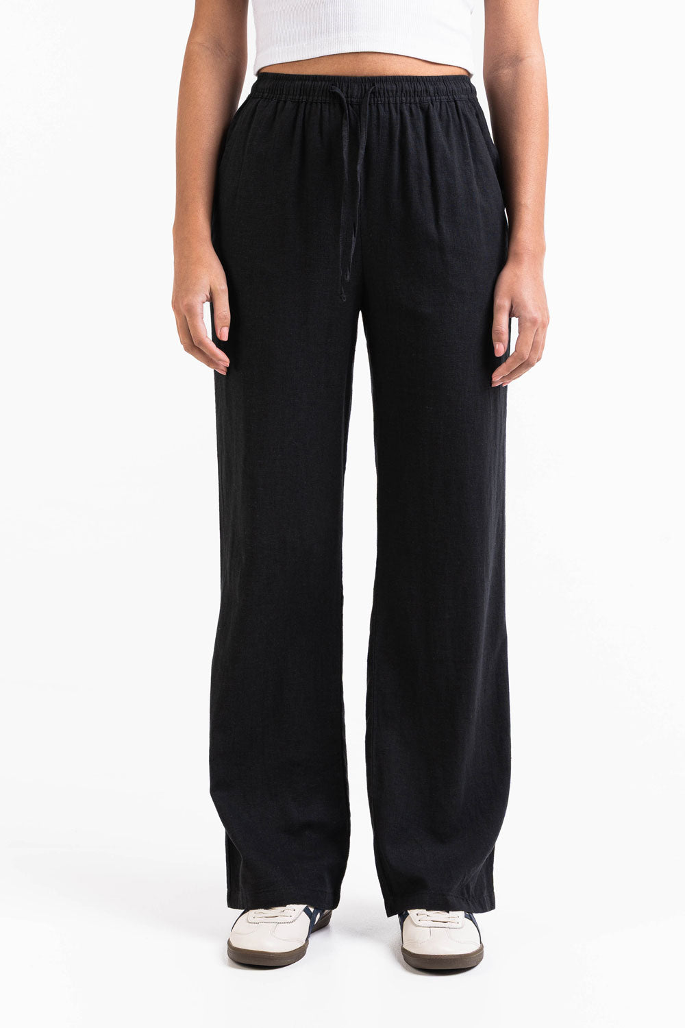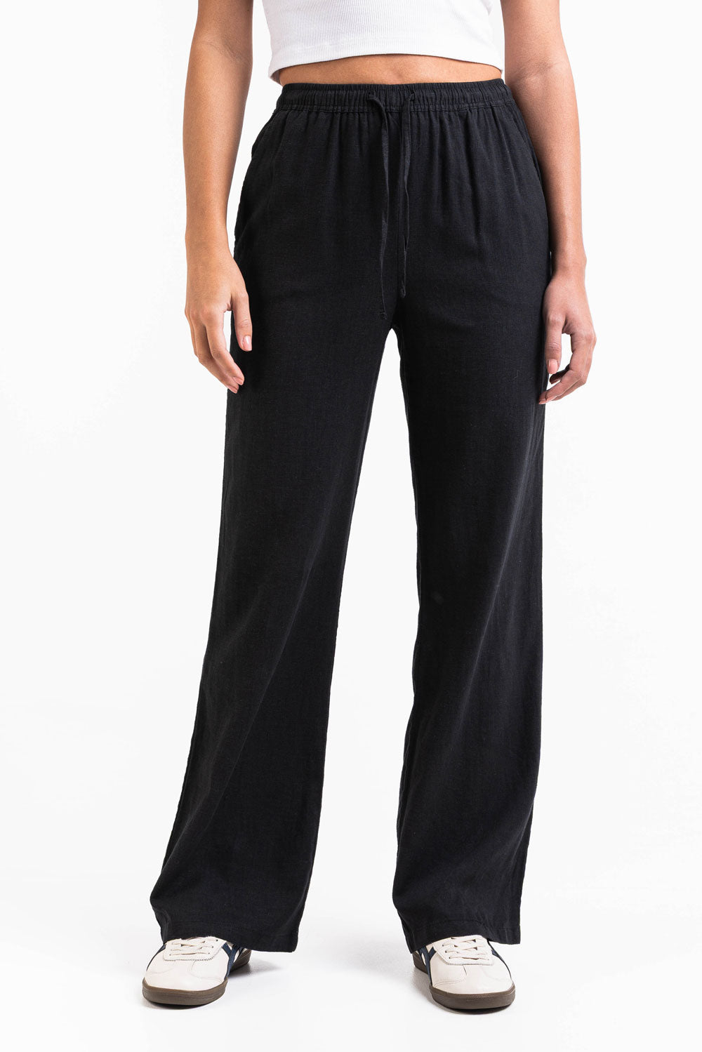 Dessa linnebyxor med hög midja har en luftig rak passform med sidofickor för funktionalitet. Den elastiska midjan, dragskon och den vikbara designen gör dem till ett enkelt val för avslappnade, bekväma outfits.