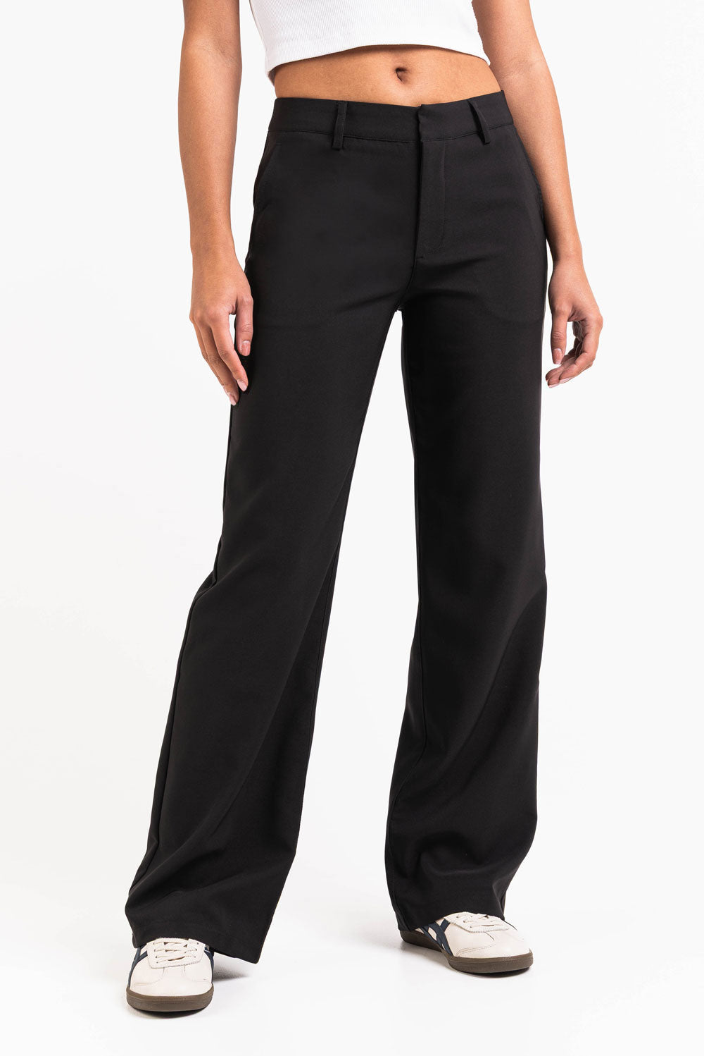 Dessa kostymbyxor med medelhög midja har en klassisk rak passform och funktionella sidofickor. Med hällor och gylf med dragkedja ger de komfort och en polerad look för både jobb och fritid.