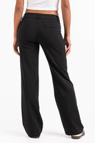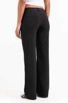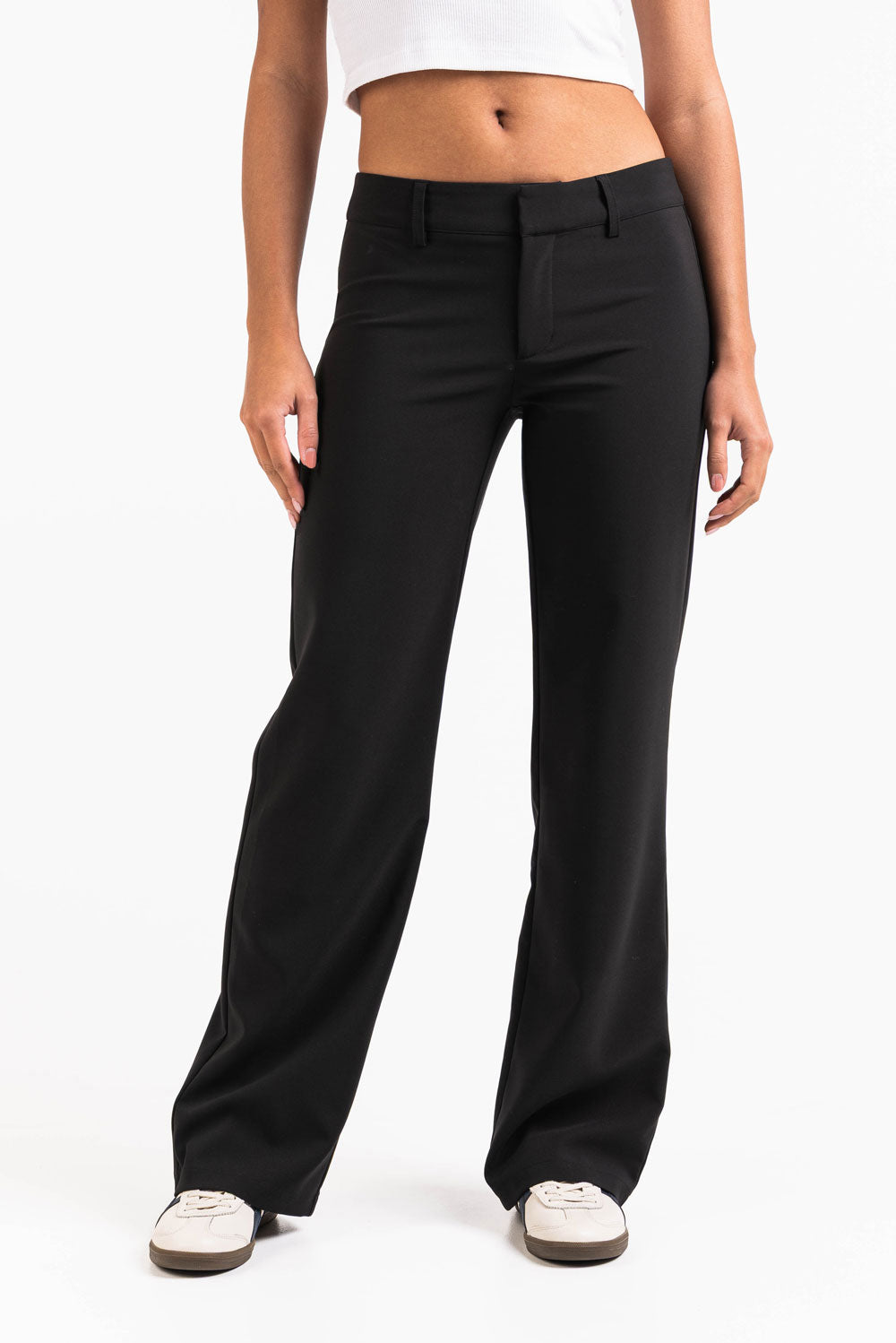 Lågmidjade kostymbyxor med raka ben. Fuskfickor baktill och bälteshällor som passar både smalare och bredare bälten. Byxorna stängs med dragkedja, hake och en dold knapp.