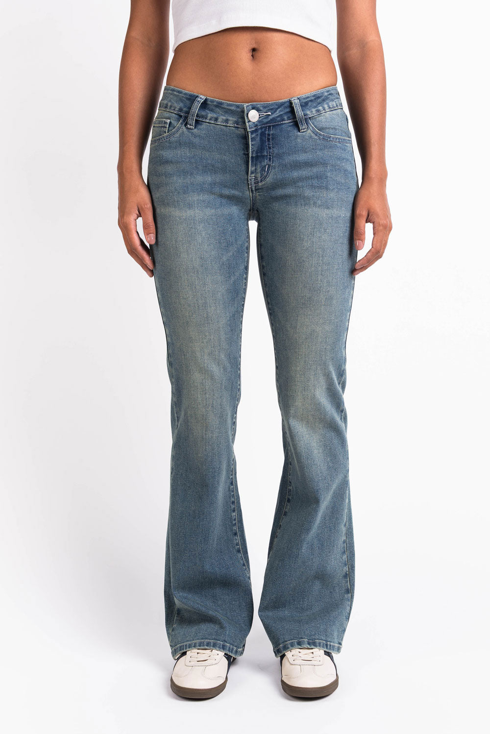 Dessa jeans med ultralåg midja har en bootcut-passform med bak- och sidofickor för praktisk användning i vardagen. Generösa hällor som passar både smala och breda skärp. Byxorna stängs med dragkedja och knapp.