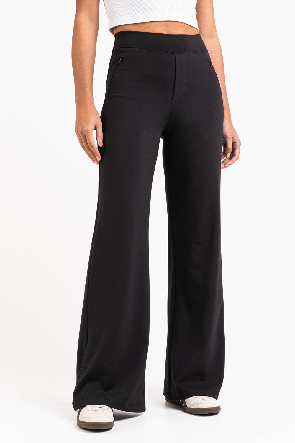 Dessa byxor med hög midja har vida ben med praktiska sidofickor. En elastisk midja och en falsk gylf ger komfort, vilket gör dem till ett mångsidigt och lättburet alternativ för vardagsbruk.