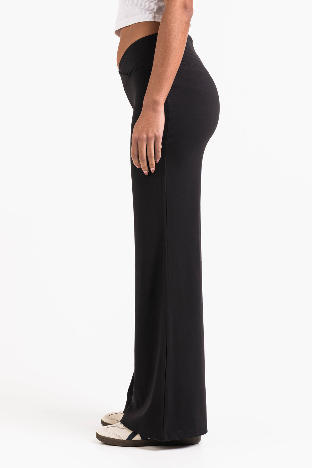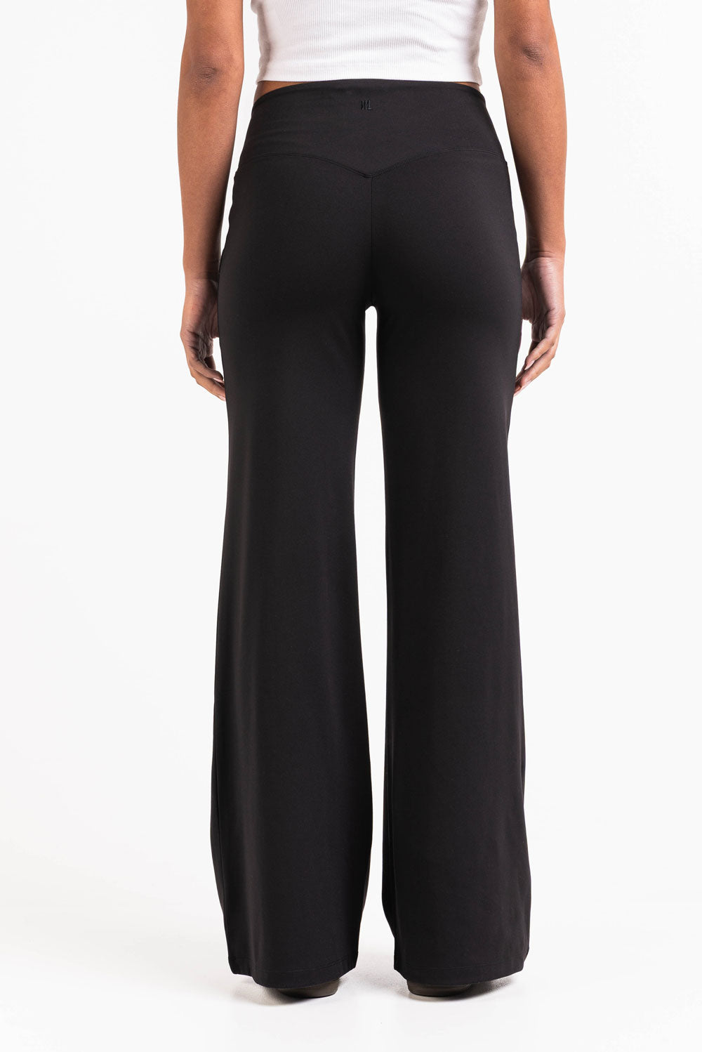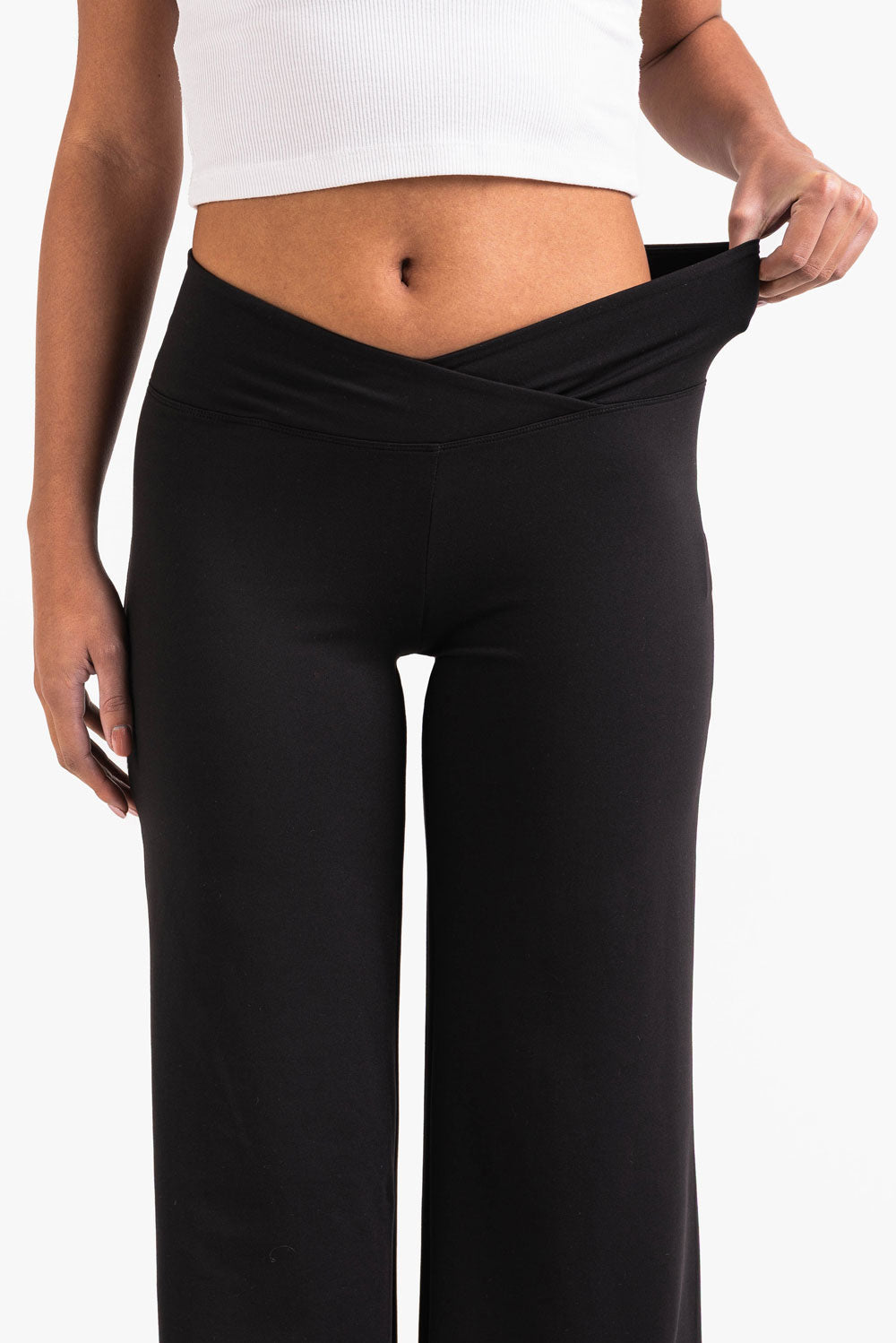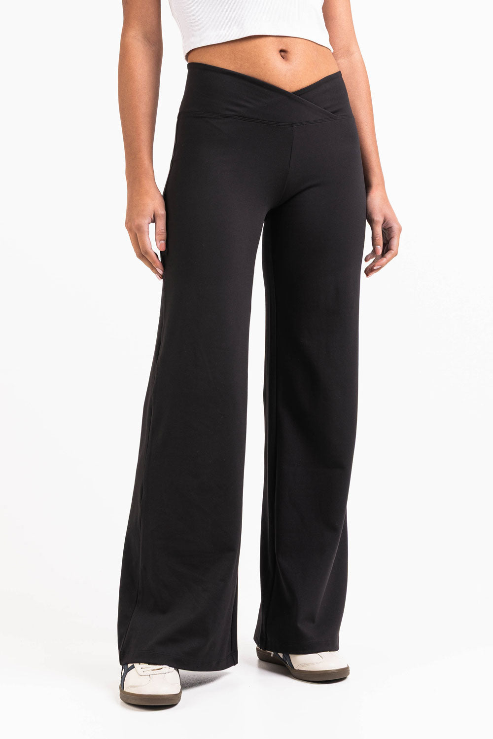 Dessa leggings med en smickrande V-formad midjeband har vida ben med en sömlös ficklös design. En elastisk midja säkerställer flexibilitet, vilket gör dessa leggings perfekta för både aktiva och avslappnade dagar.