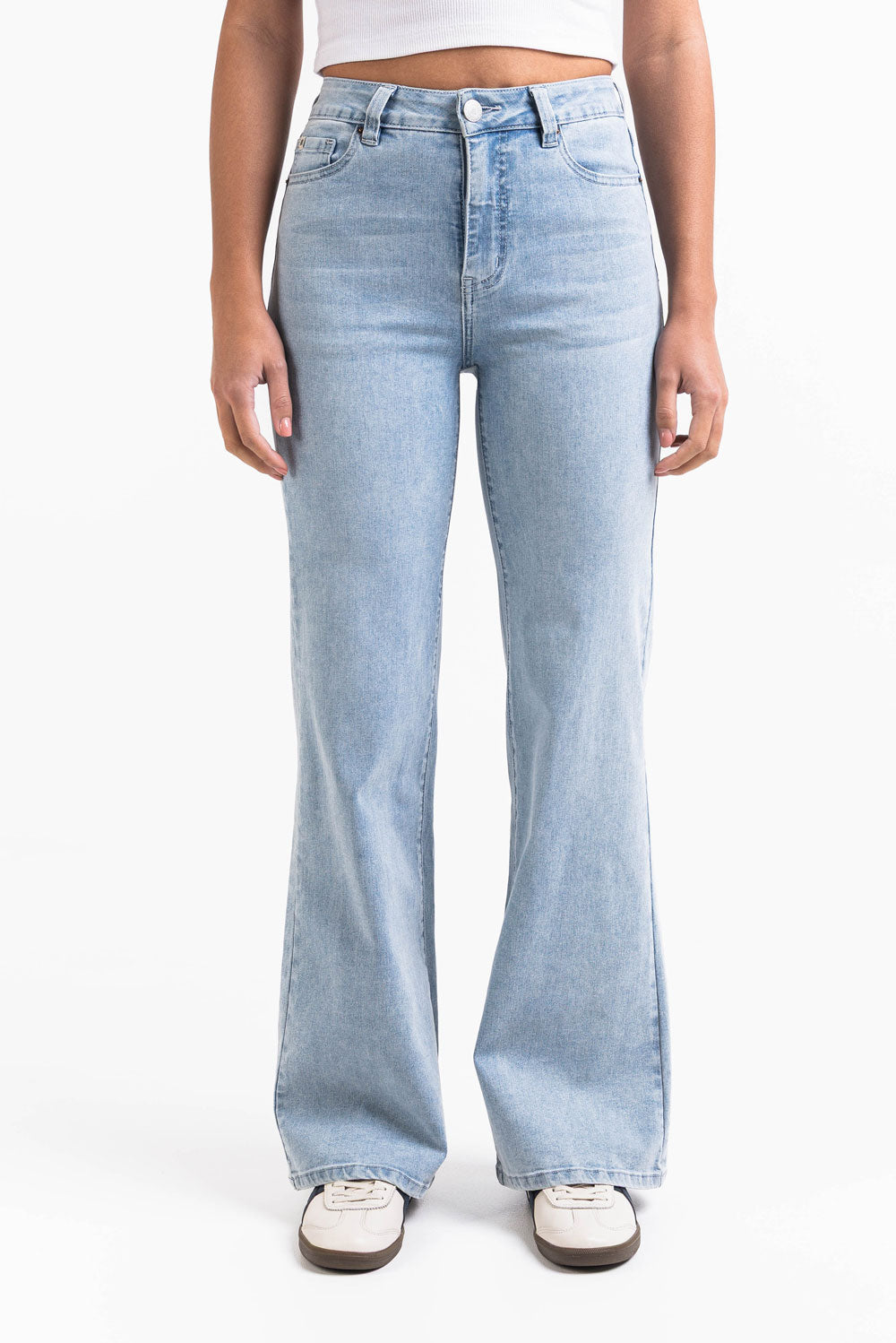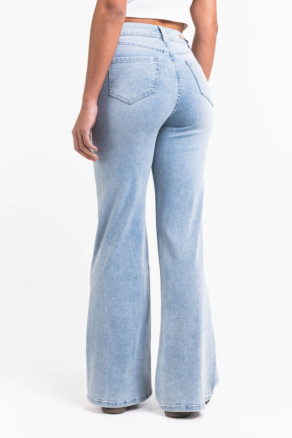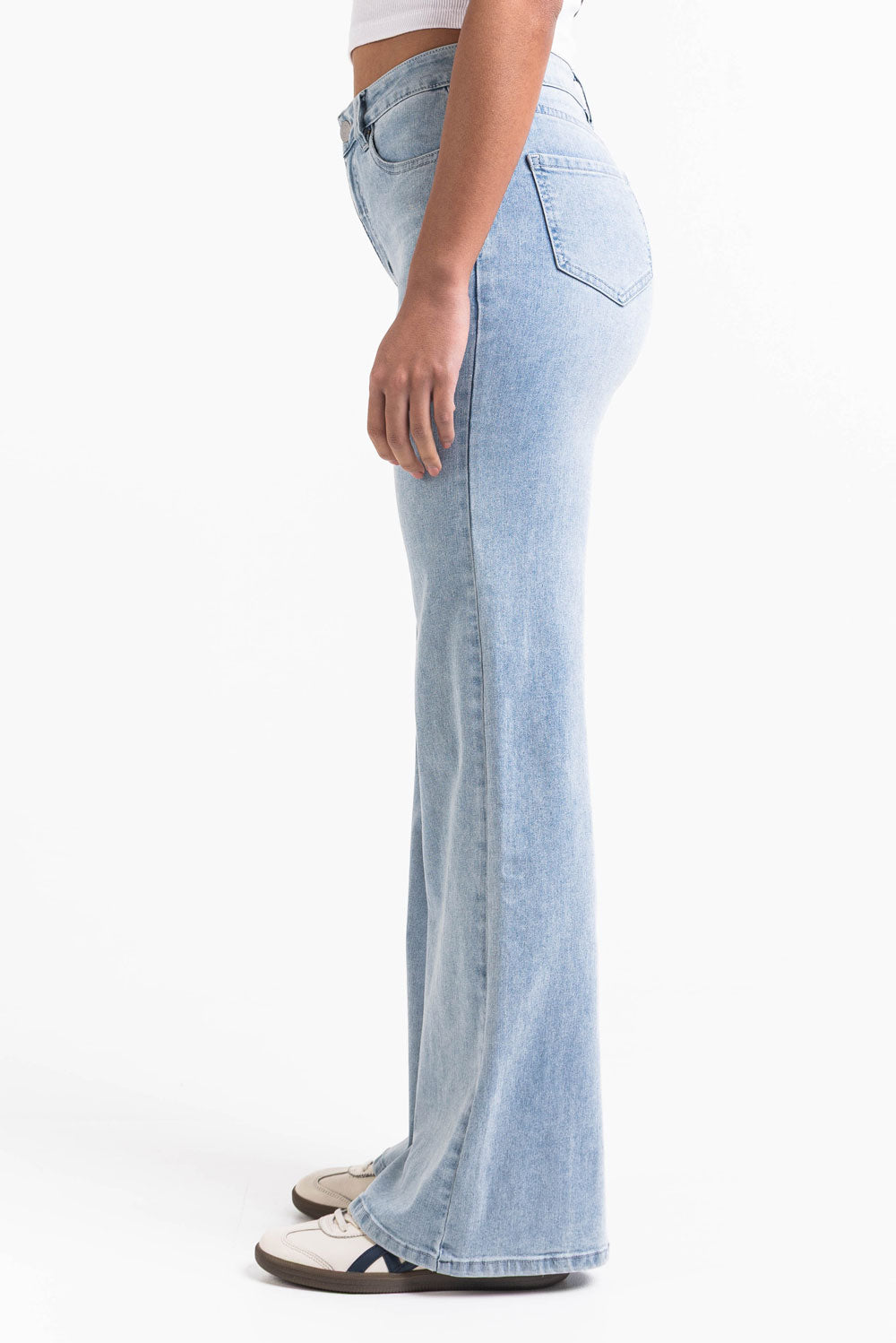 Högmidjade jeans med utsvängda ben och fickor fram och bak. Jeansen stängs med dragkedja och knapp och har hällor som passar både bredare och smalare bälten.