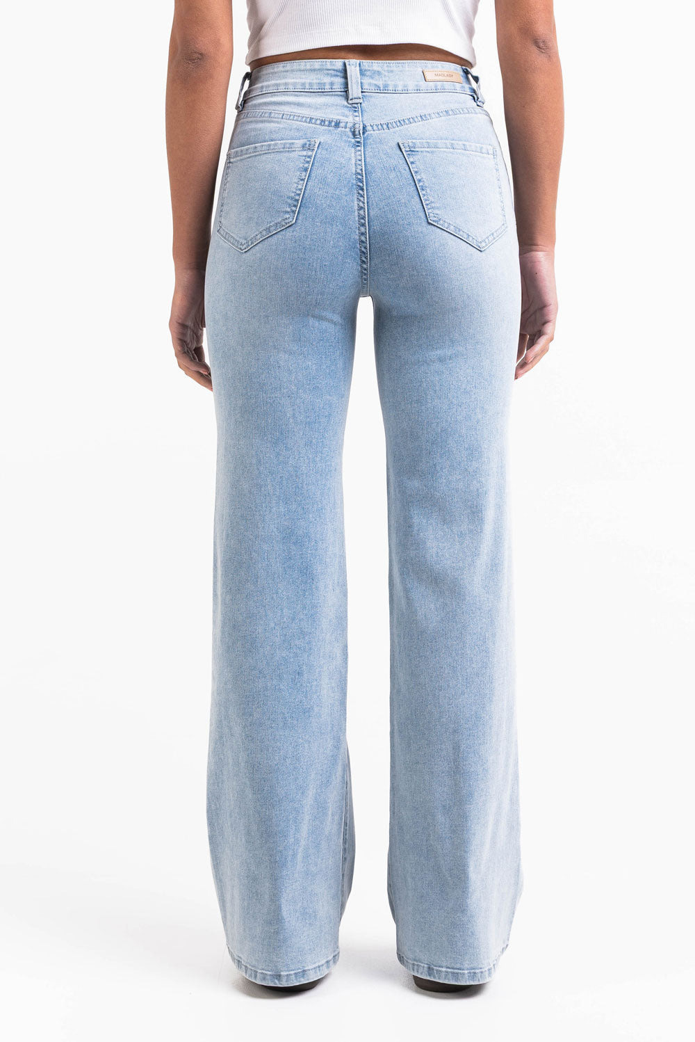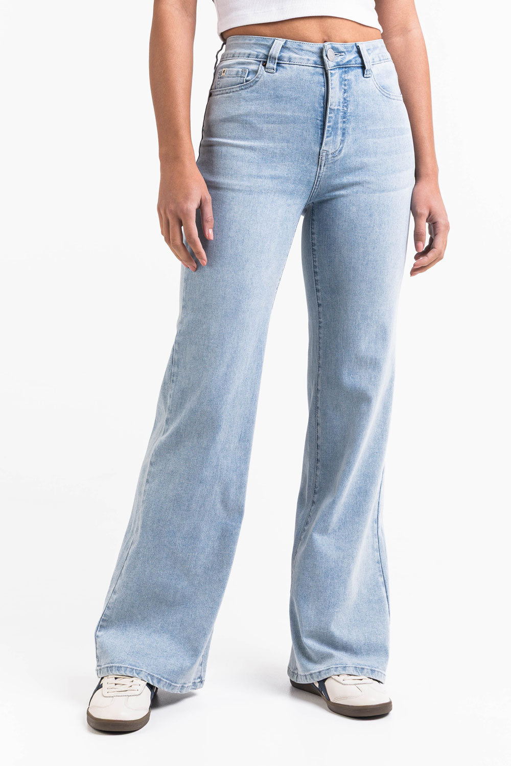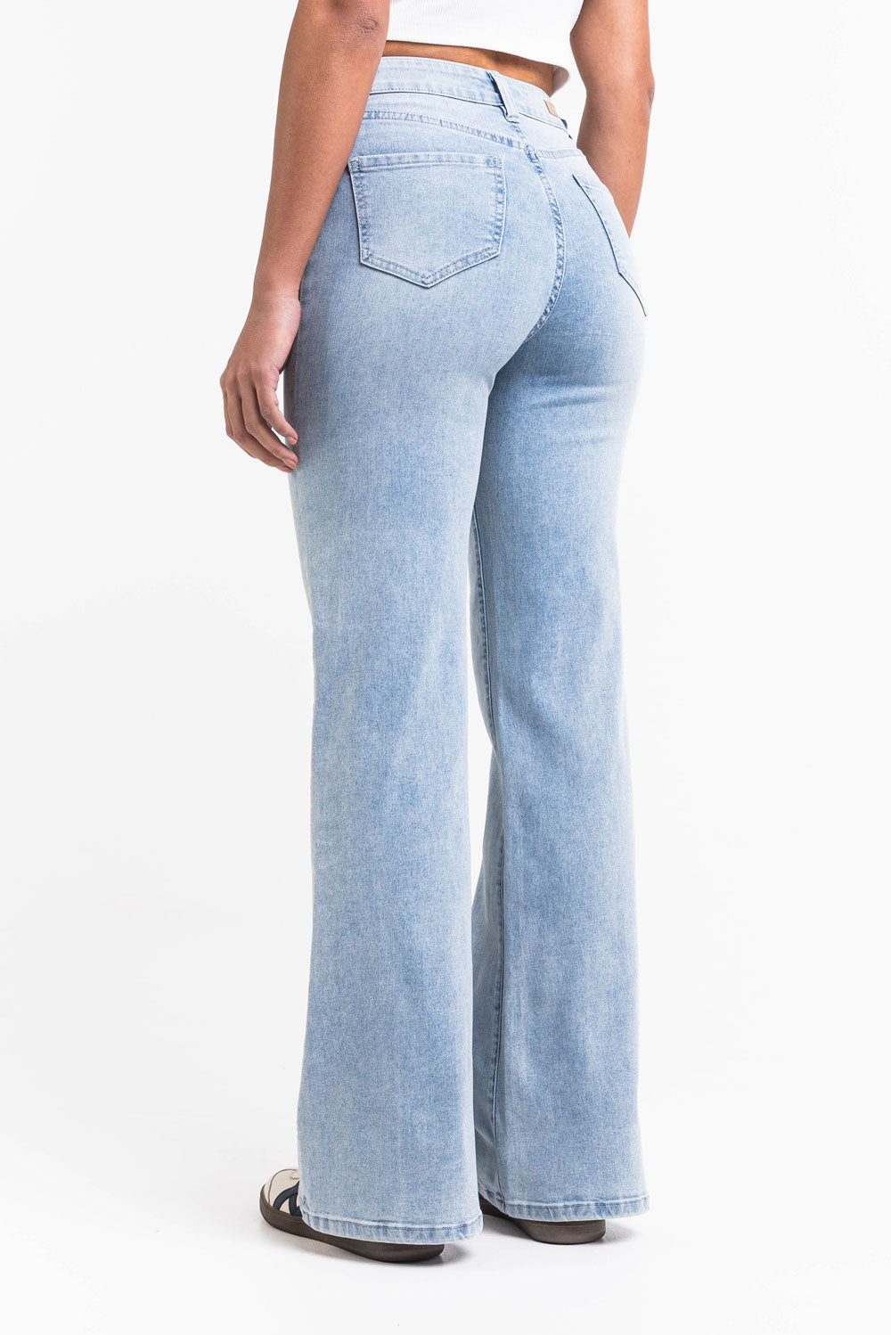 Högmidjade jeans med utsvängda ben och fickor fram och bak. Jeansen stängs med dragkedja och knapp och har hällor som passar både bredare och smalare bälten.