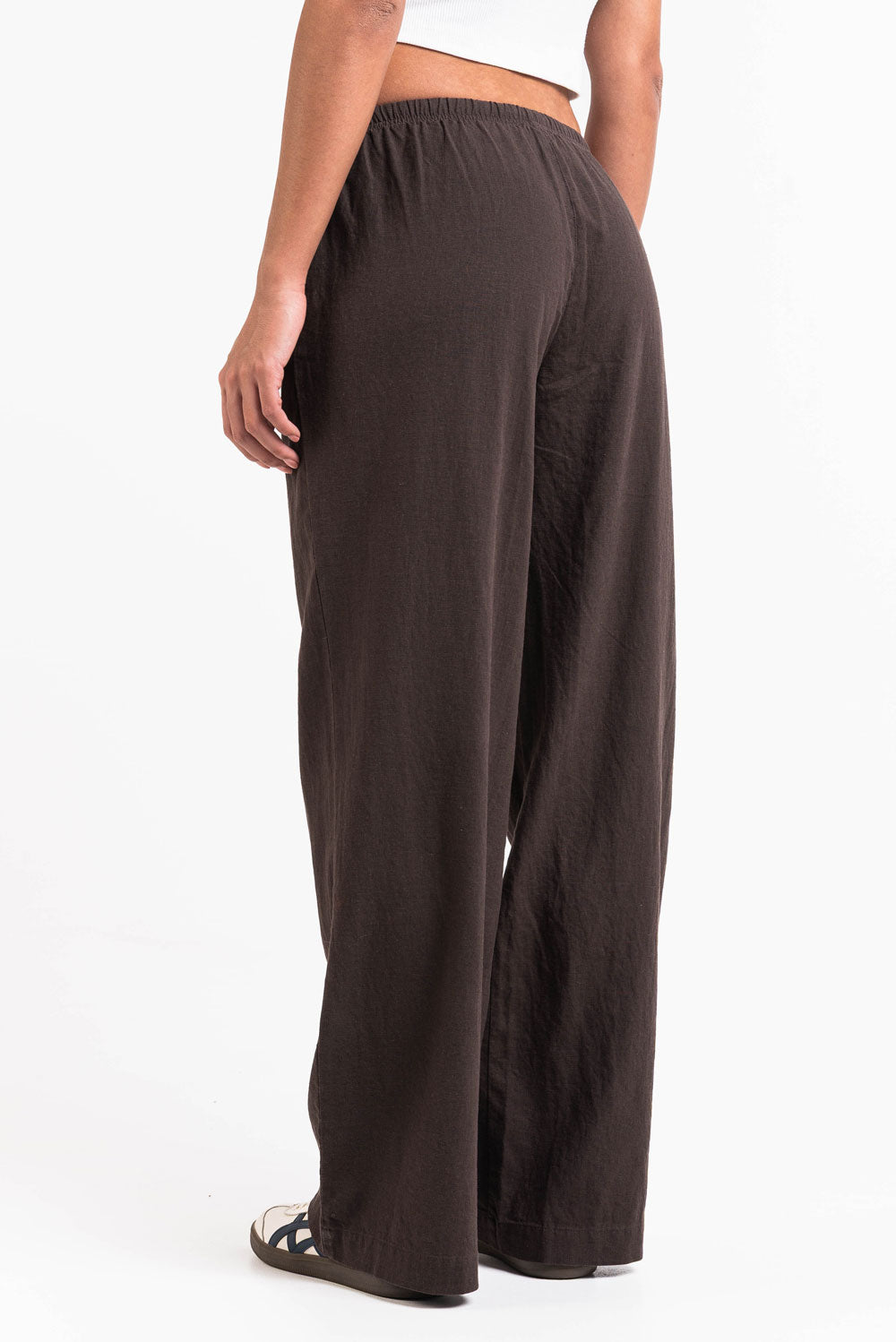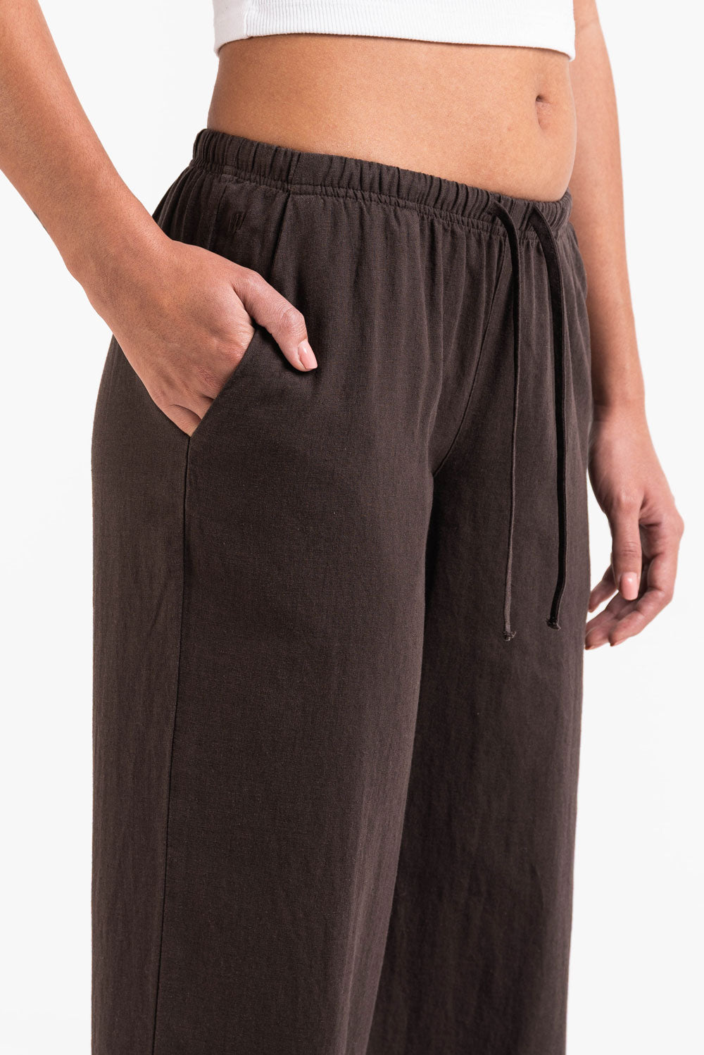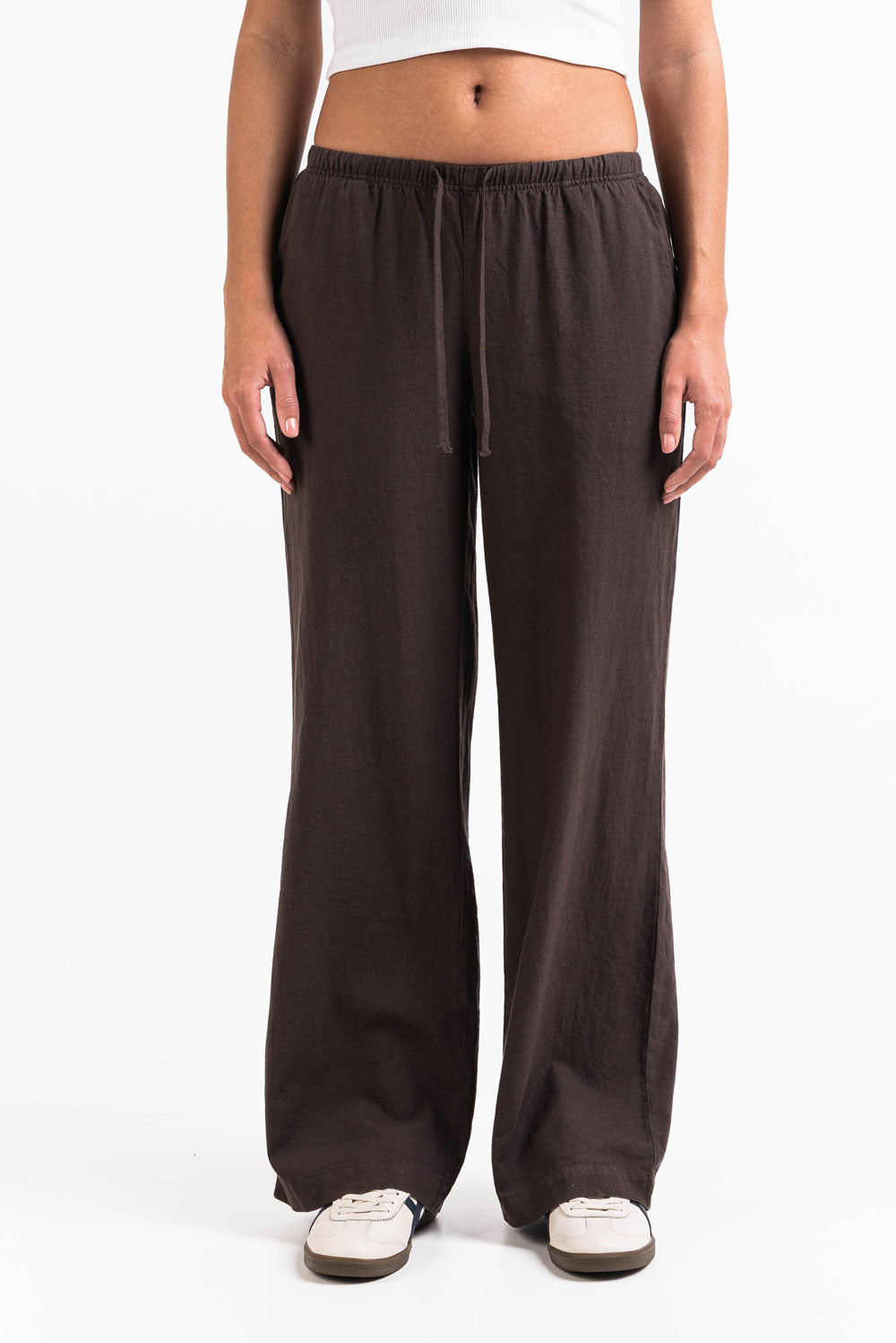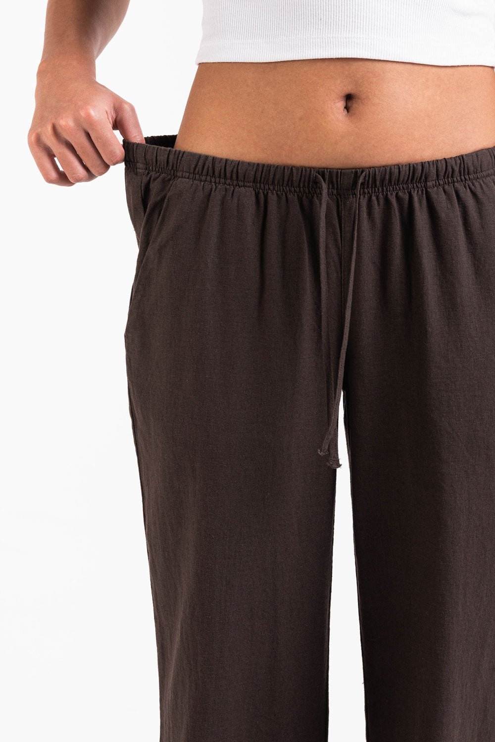 Dessa linnebyxor med låg midja har en avslappnad rak passform med sidofickor för funktionalitet. Designade med en elastisk midja och dragsko erbjuder de lätt komfort för vardagsbruk.