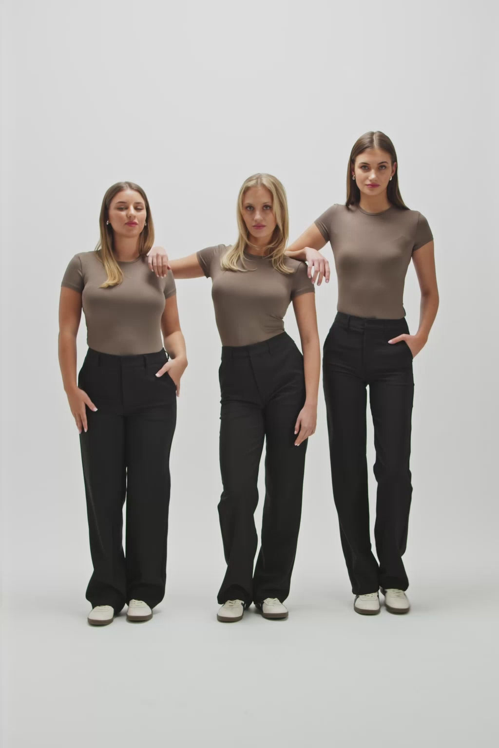 Strukturerade men aldrig stela. Våra kostymbyxor är tillverkade i ett mjukt, kroppsnära material som sitter perfekt där det ska och faller ledigt där det behövs. Eleganta, moderna och designade för att kännas lika bra som de ser ut.
