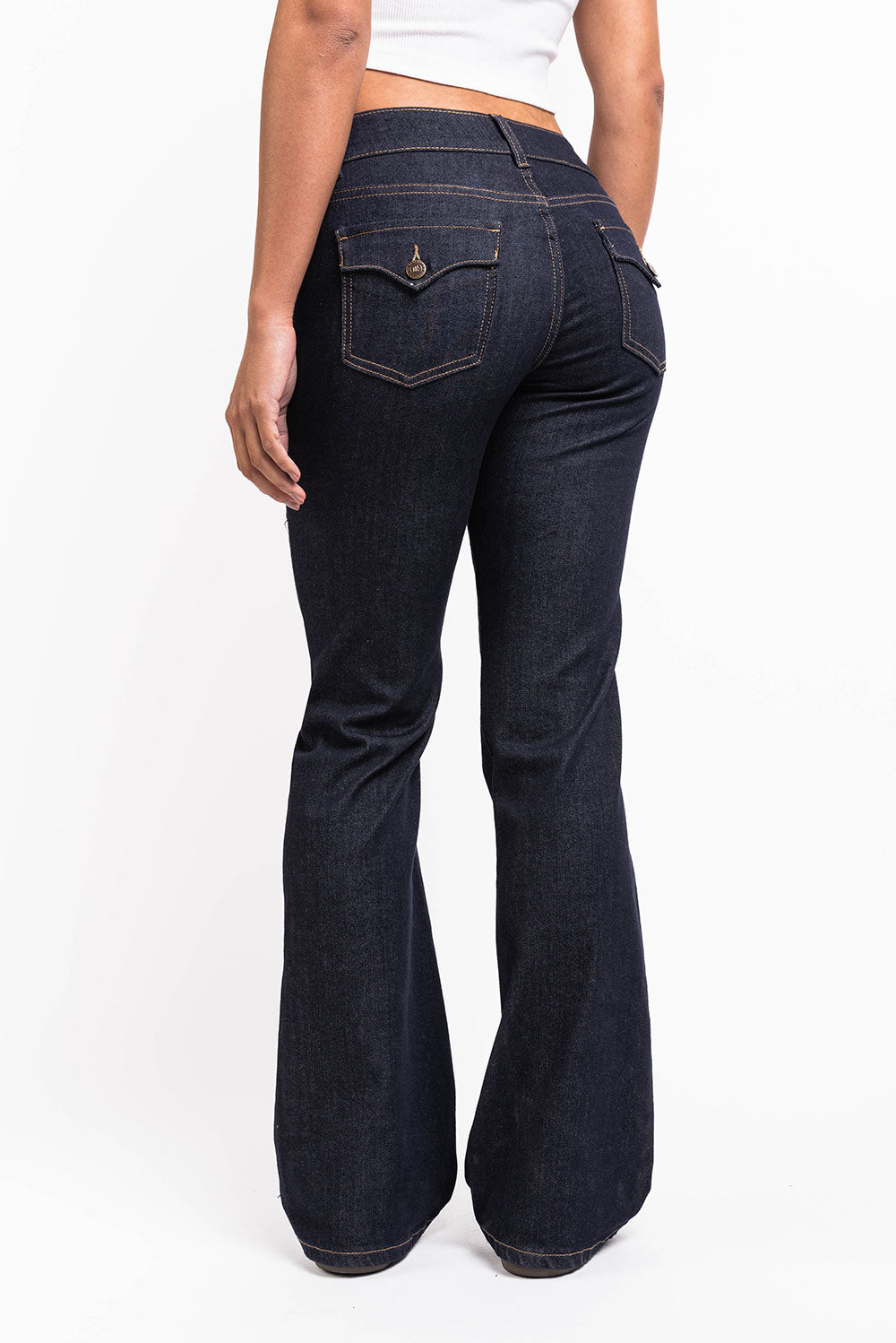 Lågmidjade jeans med utställda ben, framfickor samt två bakfickor med ficklock och knapp. Bälteshällor som passar både smalare och bredare bälten. Byxorna stängs med dragkedja och knapp.
